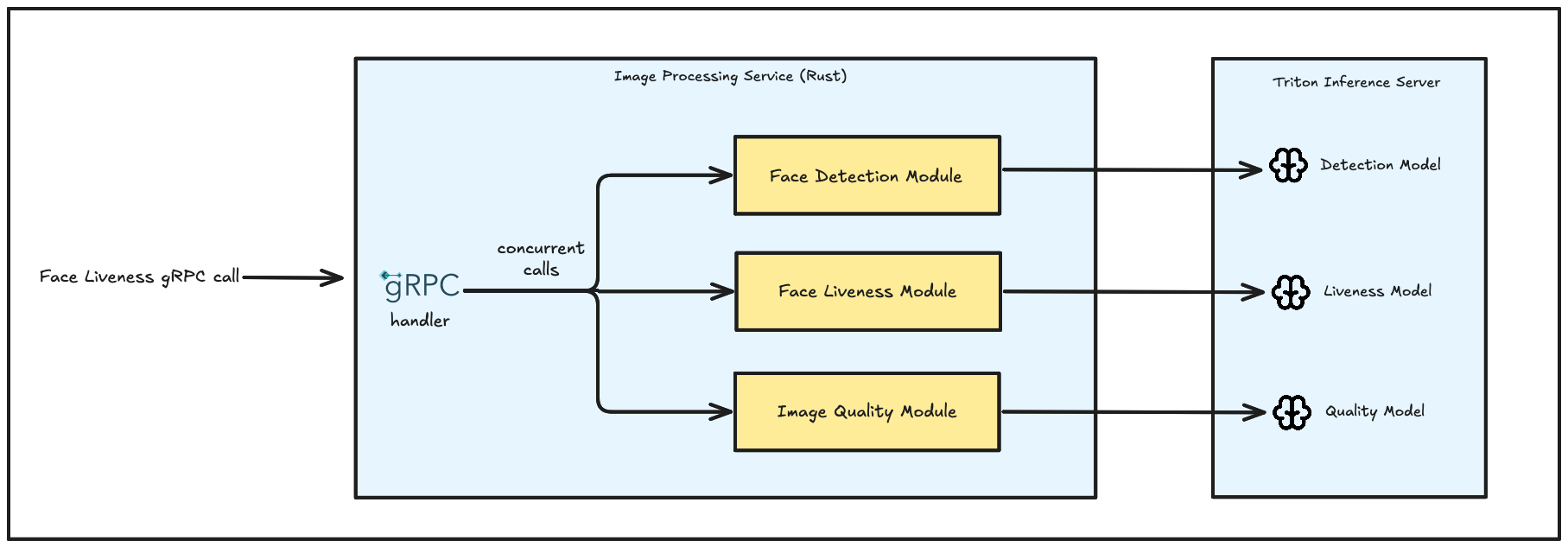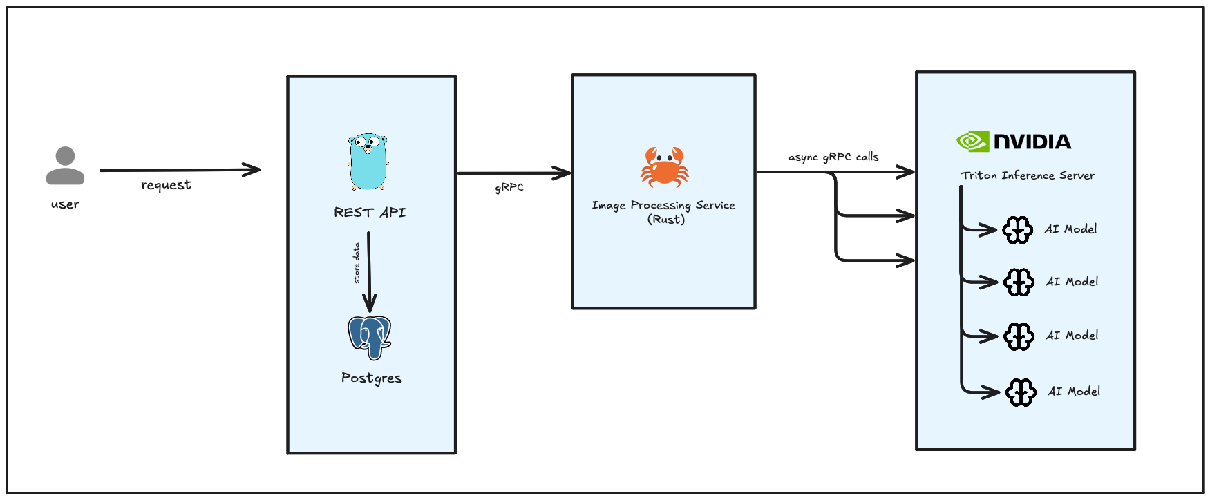 We adopted NVIDIA Triton Inference Server for GPU-heavy model computation. This allows us to isolate the process of the AI processing logic (CPU heavy) and the inference server (GPU heavy). The Rust service focuses on pre and post-processing, while triton focuses on high-throughput model execution and scheduling. This enables independent scaling, we can scale triton nodes without dragging the API along. Other than that, when there is a need to update the model, updating the model is easy with triton, without disturbing the Rust service.
